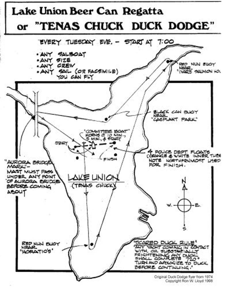 Duck Dodge was founded by Ron Lloyd, Mike Rice, and Bruce Gilbert back in the 1970's. Originally titled, Tenas Chuck Duck Dodge - and then changed to Lake Union Beer Can Regatta, this epic tradition has lasted over 5 decades and has produced some incredible Tuesday evenings for Seattle and the Pacific Northwest at large.